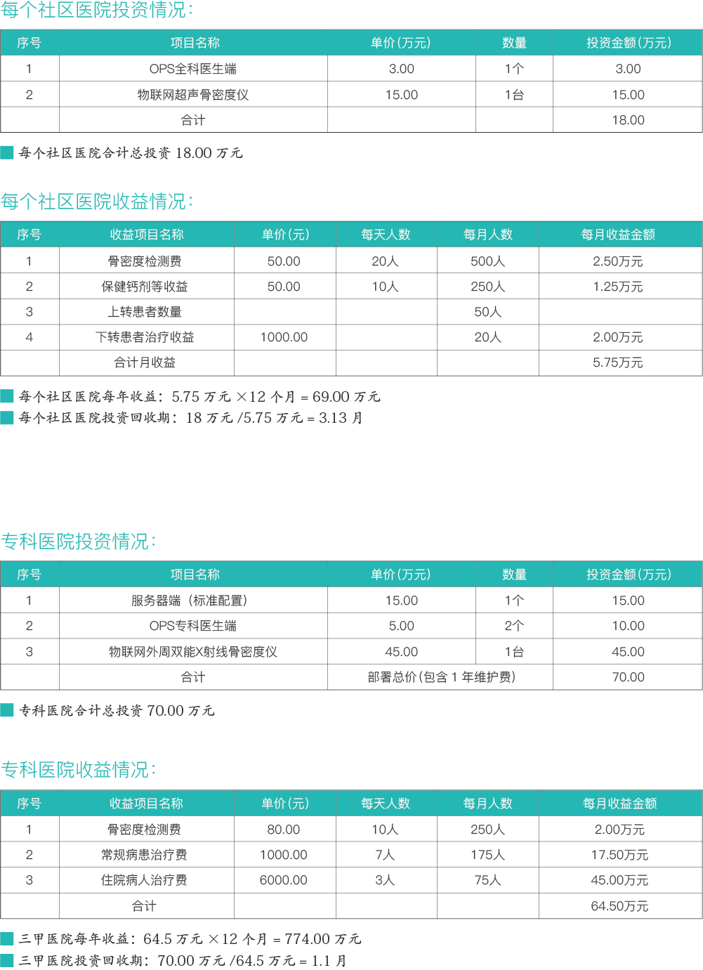 一個(gè)??漆t(yī)院與5~10家社區(qū)醫(yī)院聯(lián)合形成分級(jí)診療架構(gòu),現(xiàn)按最低5家社區(qū)醫(yī)院進(jìn)行投資收益分析。??漆t(yī)院配置2名骨松??漆t(yī)生、一個(gè)社區(qū)醫(yī)院配置1名全科醫(yī)生,社區(qū)醫(yī)院要求每天完成骨密度篩查最低20人任務(wù)量,上轉(zhuǎn)人數(shù)按10:1即每個(gè)社區(qū)醫(yī)院每天上轉(zhuǎn)2人,下轉(zhuǎn)人數(shù)按5:2,即??漆t(yī)院接收社區(qū)醫(yī)院上轉(zhuǎn)5人經(jīng)治療后下轉(zhuǎn)2人,每月按25天計(jì)算,基于這些情況進(jìn)行的投資收益分析: